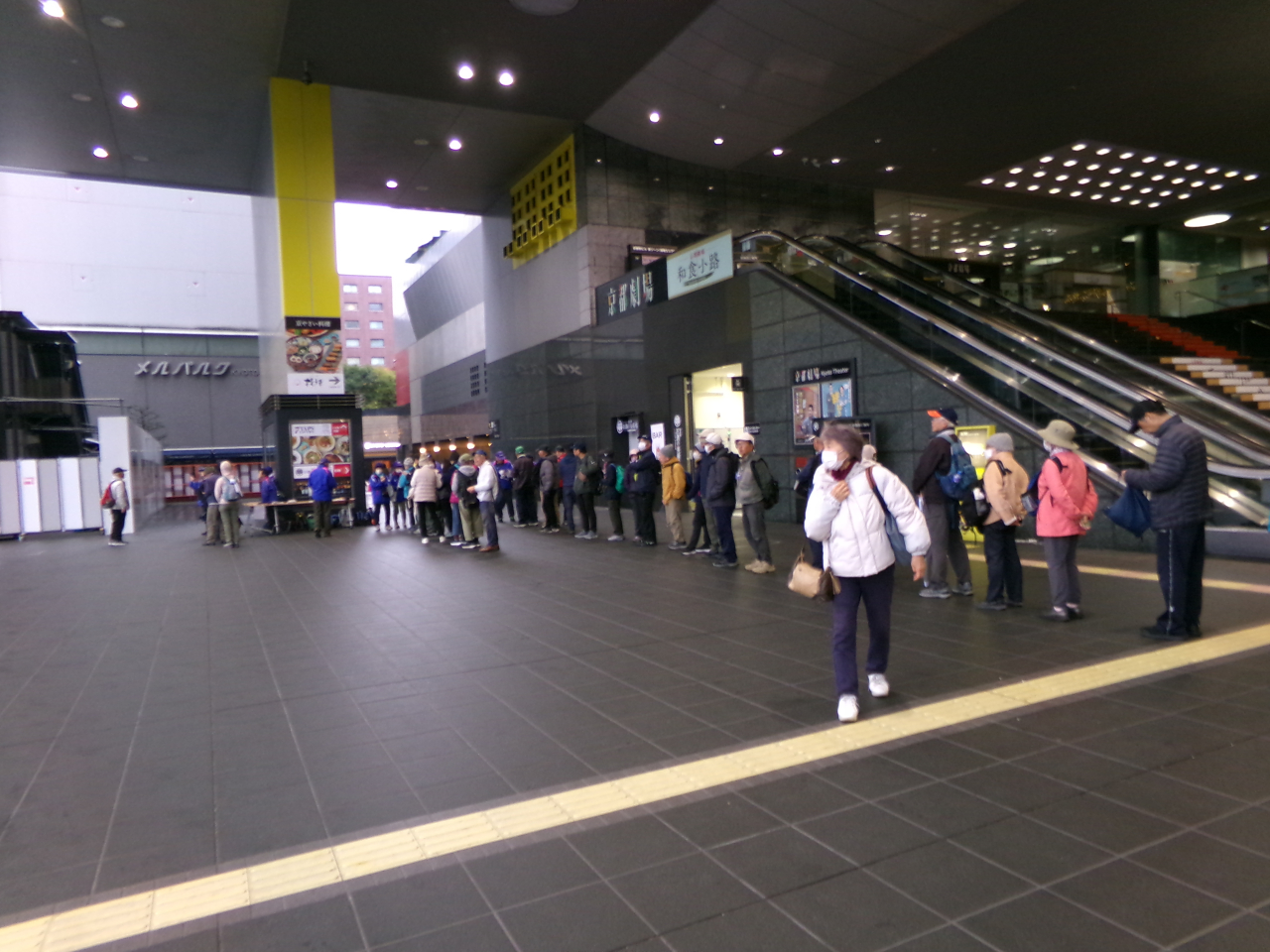 11月最後の日曜日の朝。JR・京都駅前広場。会員、一般・他協会、初参加の3つの長い行列が出来ました。受付終了後、元気に自由歩行で出発。塩小路通りを左折して、河原町通りを進むと、渉成園の境内の鮮やかな黄色のイチョウを見て、紅葉真っただ中を再認識しました。五条大橋を渡り、川端通りを北進。枝が切り取られ上部だけ残ったちょっと寂しいイチョウと、くすんだ広葉樹の葉を見て、御池大橋から仁王門通りを東進しました。岡崎公園付近まで行くと、色鮮やかな紅葉が見られひと安心。今日が紅葉の見頃との情報からか、南禅寺前は大勢の人で混雑していました。コースを外れ、境内に入り、水路閣灘の紅葉をたっぷり味わって、鹿ケ谷通りを北進すました。拝観料のいる永観堂は、門からそっと覗くだけで、哲学の道に到着しました。有料の霊鑑寺も門から中を覗くだけにして、先に進み、無料拝観できる法然院を参拝、鮮やかなモミジの紅葉に感動して、南田児童公園で昼食休憩としました。