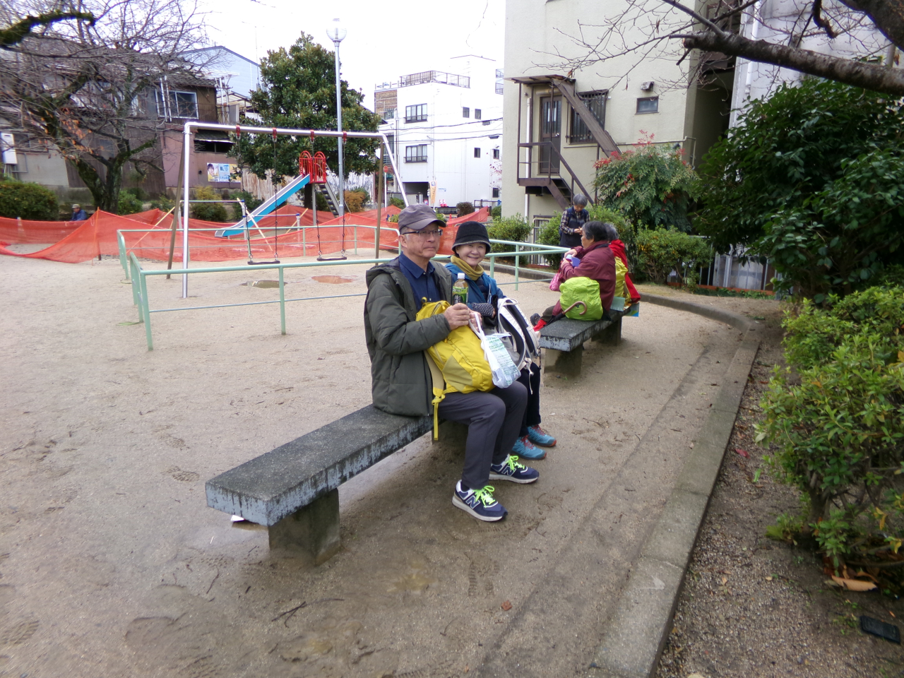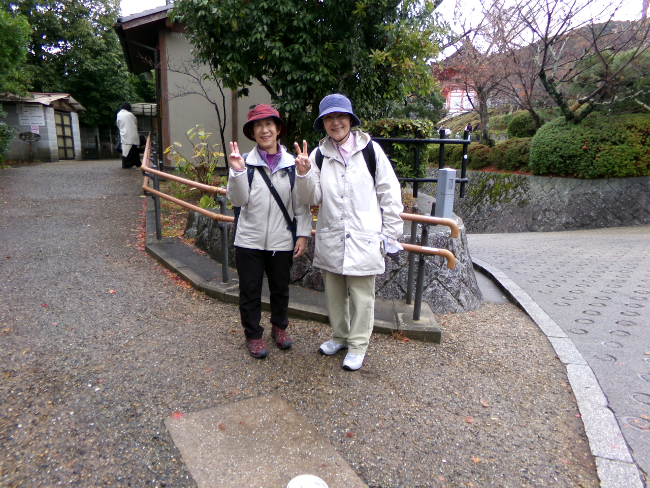 ゆるい上りの茶わん坂を進み、清水寺の入口・仁王門が見えほっとしたと思ったら、急な上りを頑張って登りトイレ前で、一服休憩しました。ここからは、下りとなり、右に左に立ち並ぶ大谷墓地を敬虔な思いでくだり、五条坂交差点に到着しました。東大路通りを下り、智積院を過ぎて左折して京都女子大に向い、新日吉神社に参拝して南下しました。右下に、JR東海道線の通過する車両を眺めながら進み、トイレなしの昼食休憩場所、宝蔵公園に到着しました。11時30分と時間もちょうど良く、座るところを捜したところ、工事中で足場が濡れていましたが、なんとか、座れそうなベンチを探し昼食休憩。