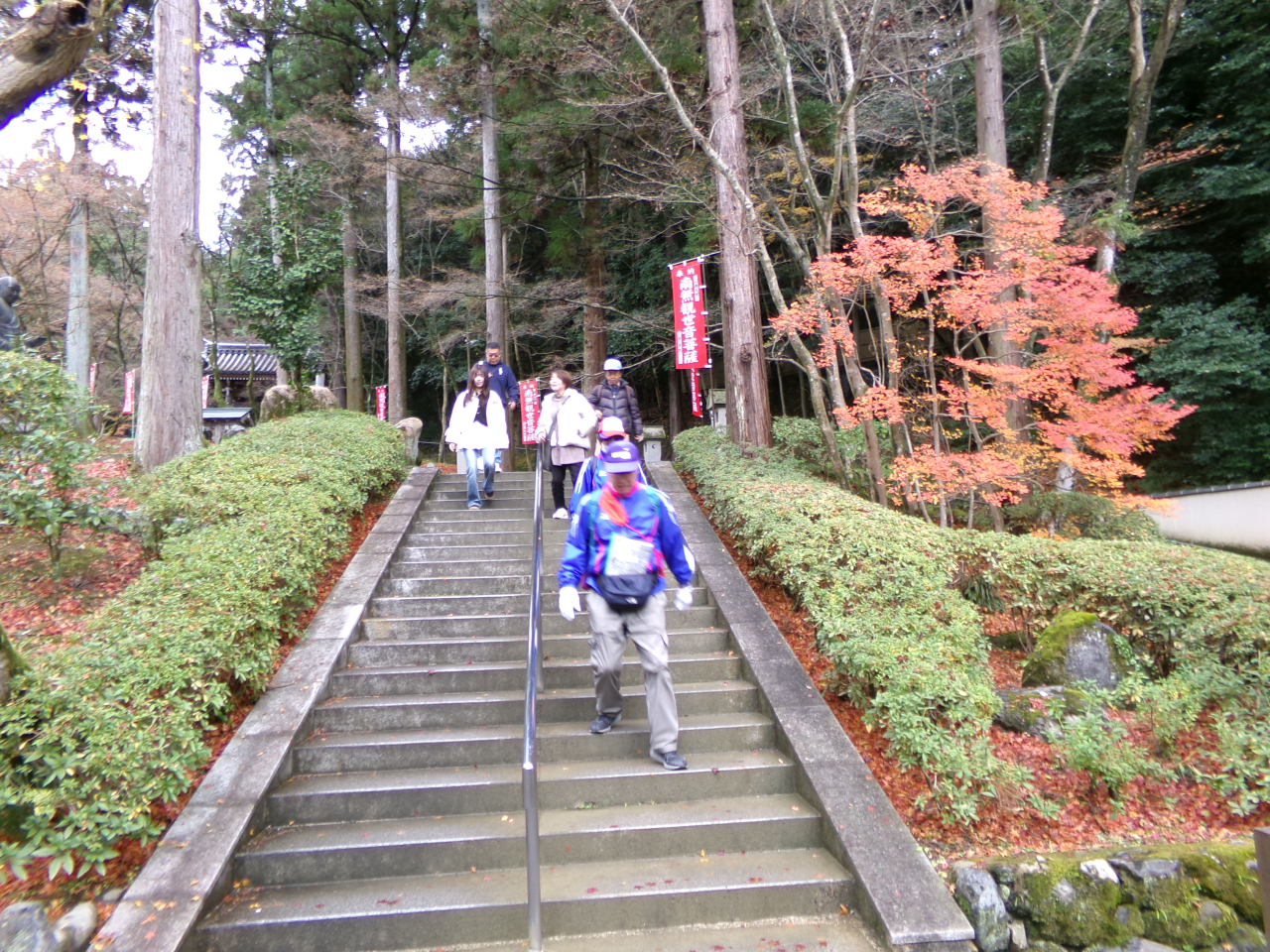 広い丸太町通りの歩道、何人からか、“何だ、この団体は?”との呆れ顔で見られる中、整然と進む。電車が遅れていたため途中の常磐野児童公園で列詰・トイレ休憩を長めにとりました。丸太町山越交差点で右折し、ゆるやかな登りの、山越道を北進、数回の列詰め休憩をして、周山街道を進み11時45分頃、平岡八幡宮に到着しました。先頭12時、アンカー12時30分出発と伝えて、昼食休憩。紅葉は終わっており、見るものはありませでしたが、中にぽつんと1本残っている、黄色のイチョウや、真紅なもみじを楽しみながら、昼食を食べました。
