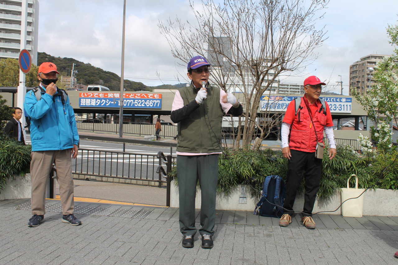 京都府、滋賀県、奈良県の3ウオーキング協会が共催する初の試み。初回の今年は滋賀県協会が運営に当たりました。次回からは交代で運営します。JR大津駅近くの大津地裁前広場で出発式が開かれ、小網勝•滋賀県ウオーキング協会会長が司会を務め、楡井仁•京都府ウオーキング協会会長と植田楢治•奈良県ウオーキング協会会長があいさつ。植田会長は「大仏鉄道の廃線跡か山の辺の道のどちらかでコースを作り、皆さまをお待ちします」と早くも呼びかけていました。