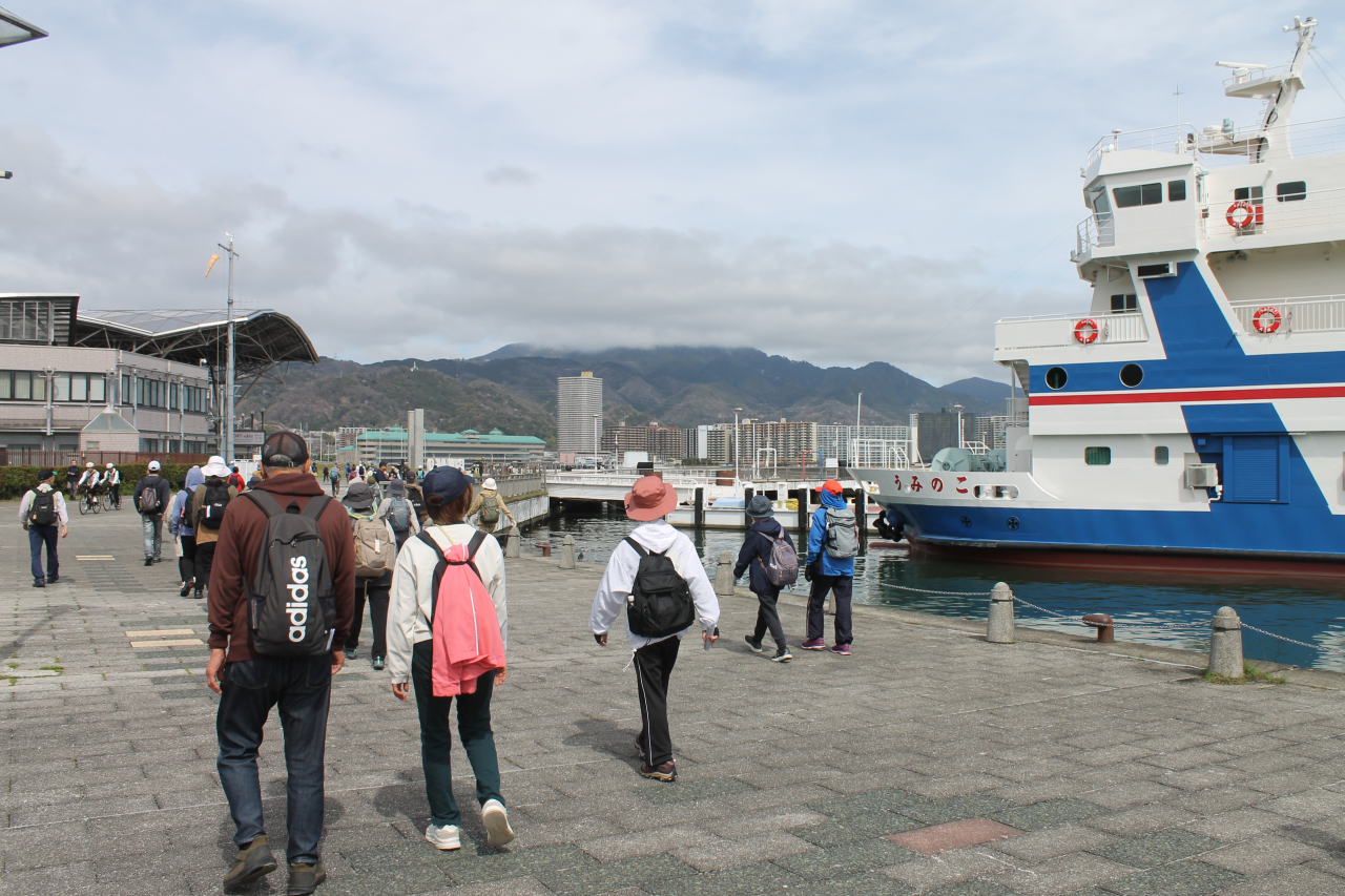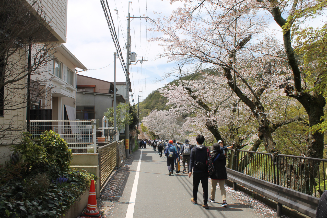 大津港で琵琶湖を眺めたあと、三井寺駐車場で休憩。小関越えの登り坂にかかり、峠近くの地蔵菩薩の祠に参拝してから、山科盆地へ下りました。前夜にまとまった雨が降り桜の咲き具合が案じられましたが、琵琶湖疏水では鮮やかなピンクの並木が連なり、遊覧船が時折通り過ぎると参加者の歓声があがっていました。