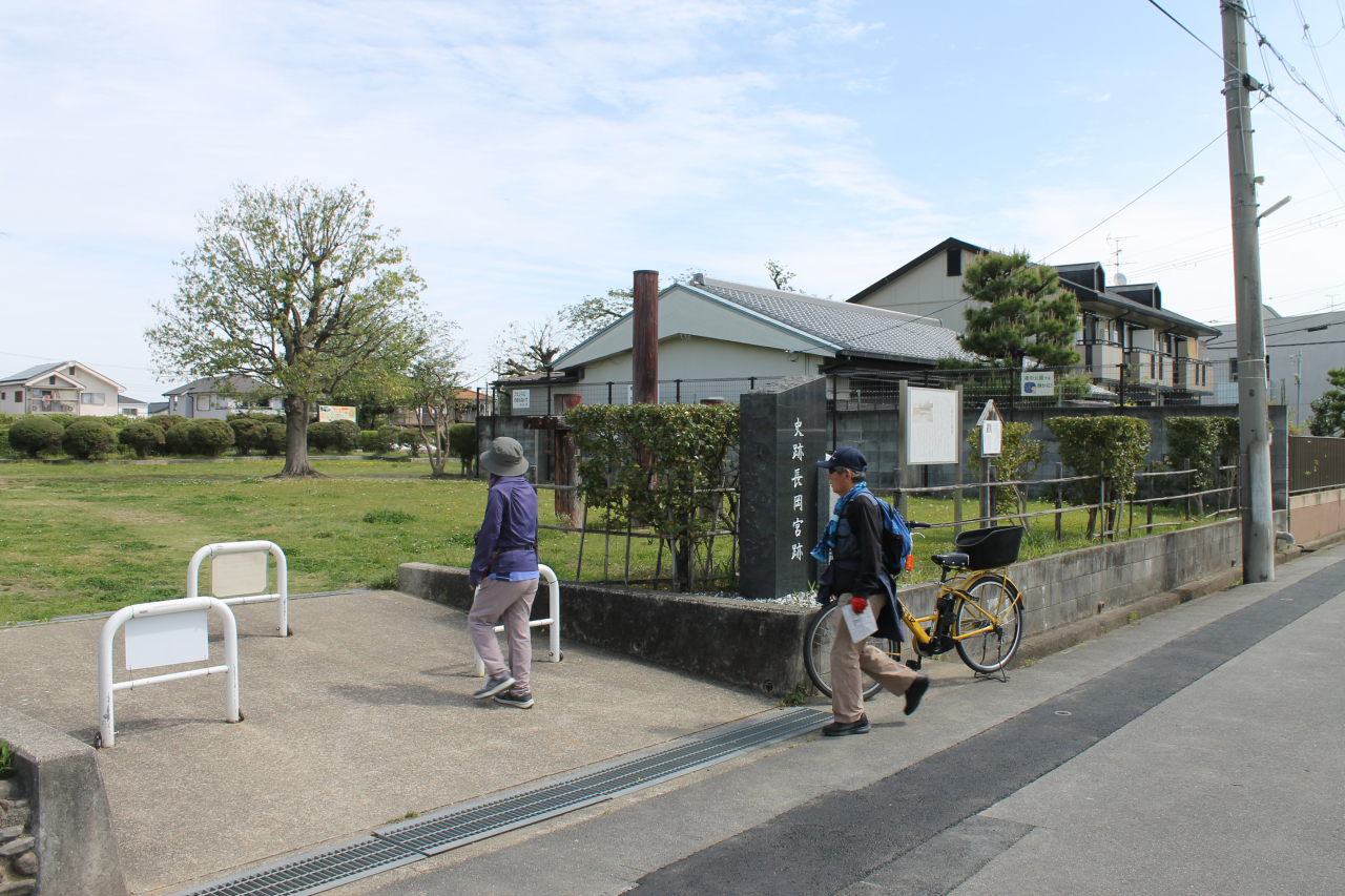 絶好の日和に恵まれ、石畳の西国街道から小畑川の水辺を通り一文橋を渡る快適な出だしでした。公園整備された長岡宮大極殿跡でひと休みしてから向日神社へ。参拝後は裏手の急階段を慎重に降りました。