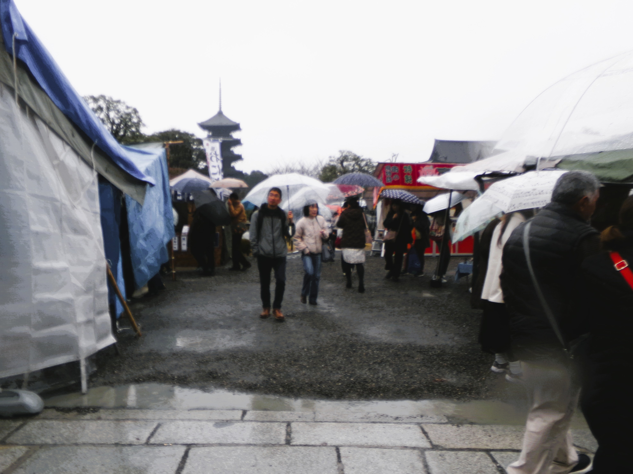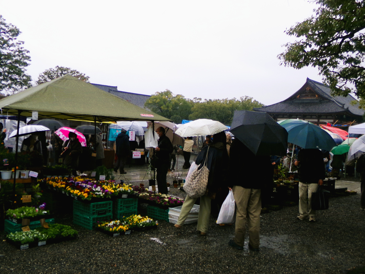 終い弘法では立ち並ぶ出店の間を、傘を上下しながら混雑する人波をかき分け進みました。結構大雨の中でも、清水寺や嵐山のような混雑ぶりに、年末行事の人気の高さを再認識して帰路に着きました。