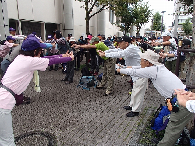 水度神社を経て、鴻巣山への緩やかな登り道をゆっくり歩いてひと汗かくと、展望台を越えて鴻ノ巣山運動公園に着き、列詰めトイレ休憩をとりました。さらに進んでスポーツのイベントで賑わう太陽が丘運動公園でも、休憩しました。
