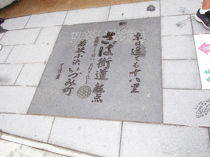 六時半にホテルを出発してさば街道起点のいづみ商店街の新しくできた鯖街道資料館前で 記念撮影をして、八幡神社に参り、いよいよ京都出町柳桝形商店街を目指して出発しました。朝の静かな小浜の街を通り抜けて、約50分ほどで若狭姫神社に到着しました。例年なら、ここで若狭街道チームと針畑越えチームに分かれるのですが、2日前の雨で針畑越えコースの荒れが予想されるので、今回も全員若狭街道コースで出発しました。出発して最初の給水ポイントのJR新平野駅では冷たくておいしいトマトをほおばりました。再出発して間もなく雨が強く降ってきて途中雨宿りを余儀なくされました。少しやみかけたところで歩きだし、瓜割の滝に着きましたが、予定時間が遅れ気味なので瓜破の滝には行かずに、少しの休憩の後、先に進みました。時々の強く降る雨に悩まされながらパレア若狭を経て上中の田園風景を楽しみながら熊川宿に着き大きなおにぎり弁当を頂きました。