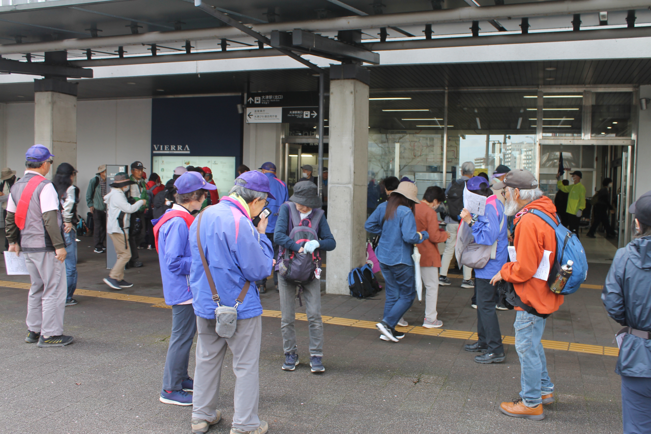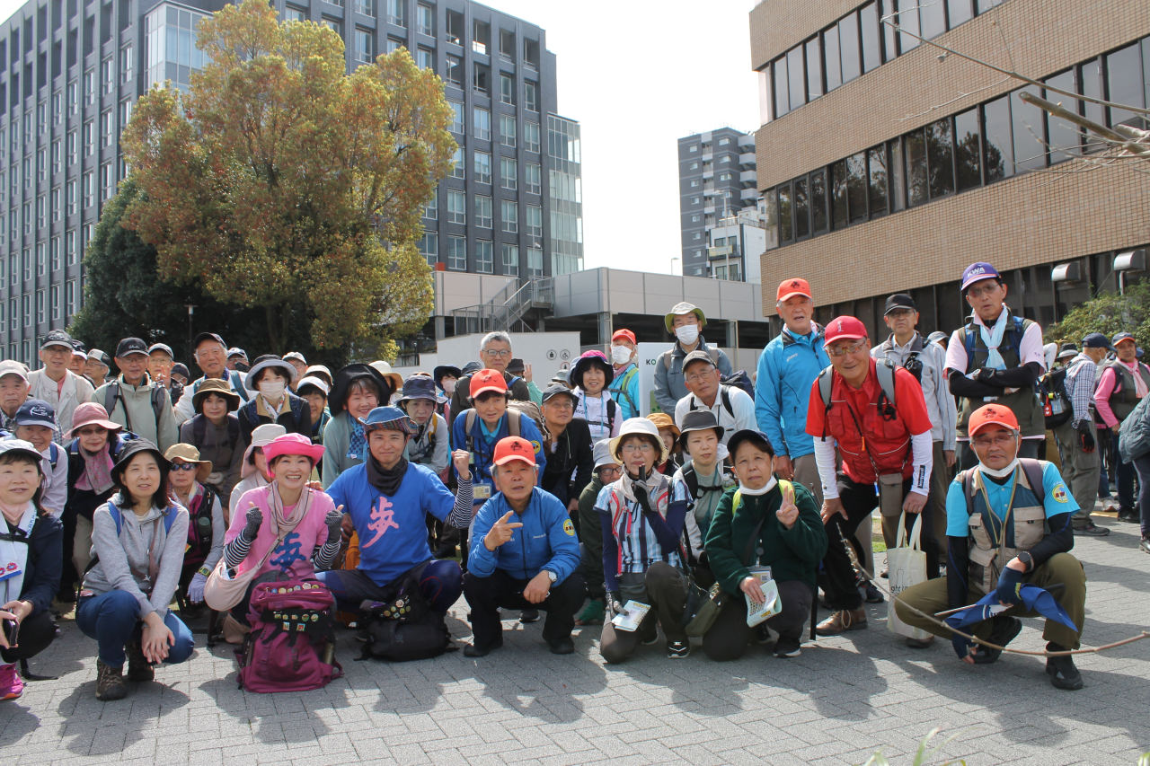 京都府、滋賀県、奈良県の3ウオーキング協会が共催する初の試み。初回の今年は滋賀県協会が運営に当たりました。次回からは交代で運営します。JR大津駅近くの大津地裁前広場で出発式が開かれ、小網勝•滋賀県ウオーキング協会会長が司会を務め、楡井仁•京都府ウオーキング協会会長と植田楢治•奈良県ウオーキング協会会長があいさつ。植田会長は「大仏鉄道の廃線跡か山の辺の道のどちらかでコースを作り、皆さまをお待ちします」と早くも呼びかけていました。