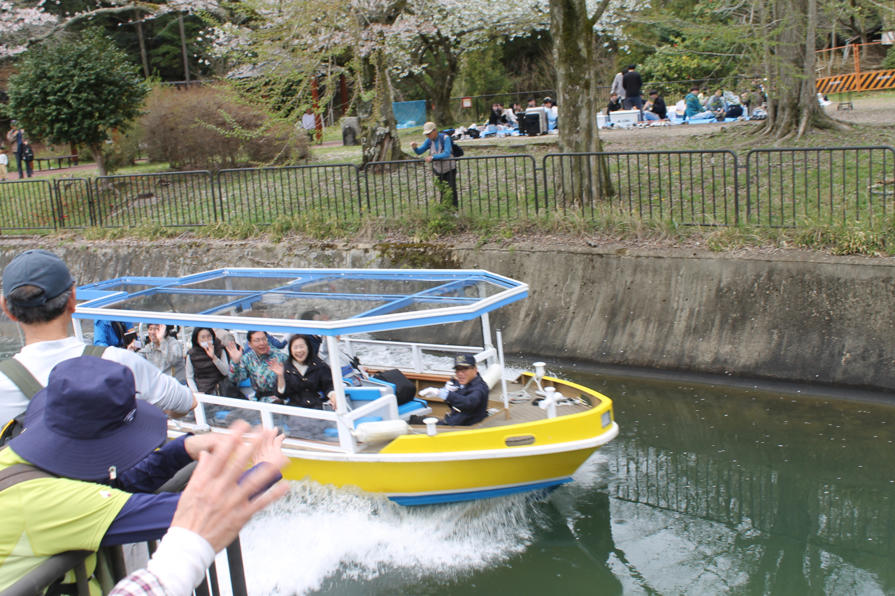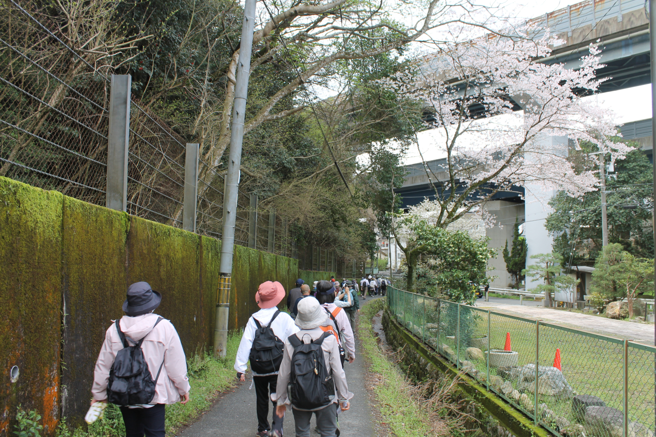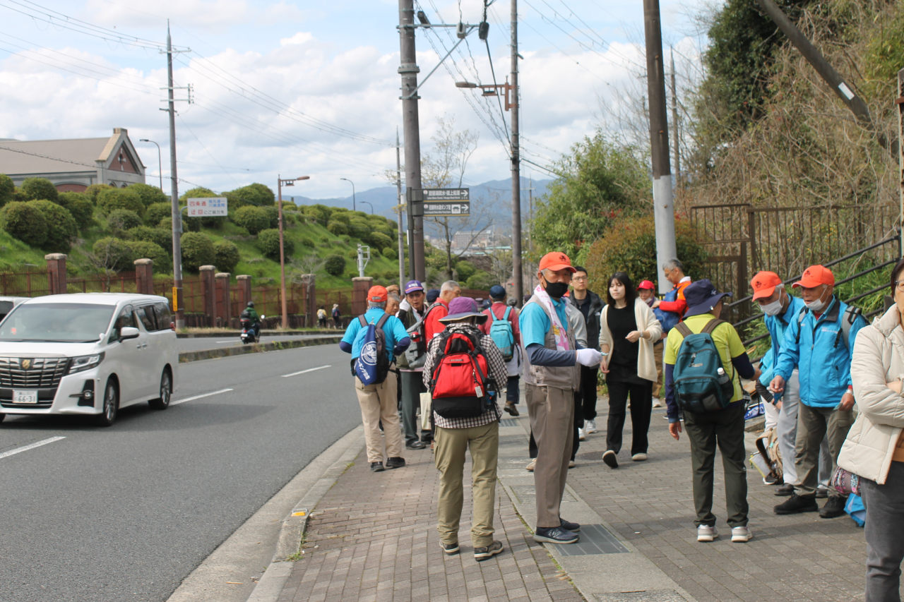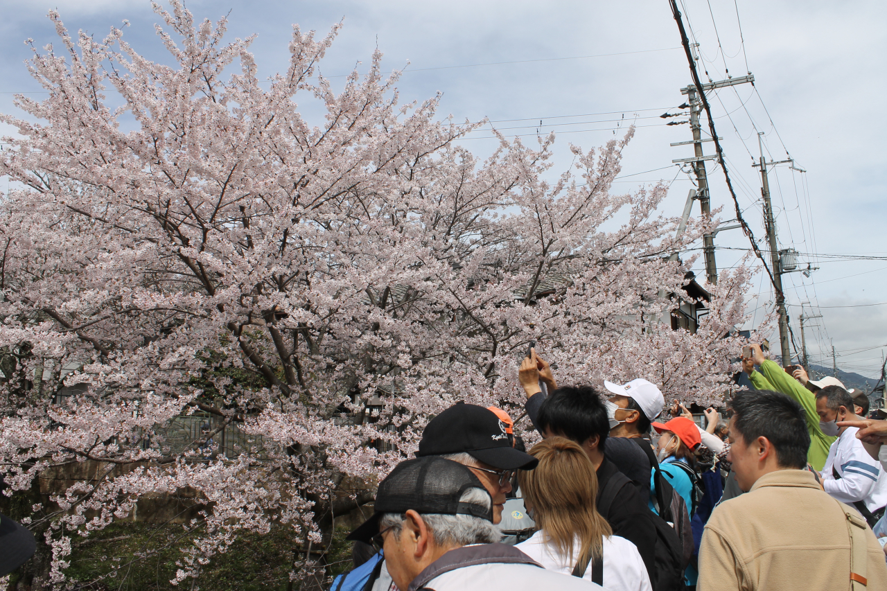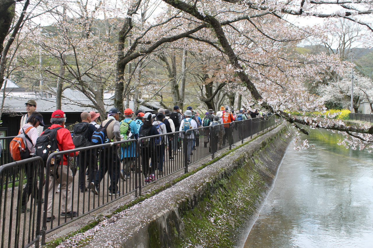 大津港で琵琶湖を眺めたあと、三井寺駐車場で休憩。小関越えの登り坂にかかり、峠近くの地蔵菩薩の祠に参拝してから、山科盆地へ下りました。前夜にまとまった雨が降り桜の咲き具合が案じられましたが、琵琶湖疏水では鮮やかなピンクの並木が連なり、遊覧船が時折通り過ぎると参加者の歓声があがっていました。